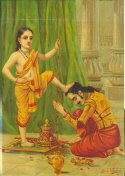 In the city of Pratiṣṭhāna-pura, long ago, there resided a brāhmaṇa who was poverty-stricken but innocent and not dissatisfied. One day he heard a discourse in an assembly of brāhmaṇas concerning how to worship the Deity in the temple. In that meeting, he also heard that the Deity may be worshiped within the mind. After this incident, the brāhmaṇa, having bathed in the Godāvarī River, began mentally worshiping the Deity. He would wash the temple within his mind, and then in his imagination he would bring water from all the sacred rivers in golden and silver waterpots. He collected all kinds of valuable paraphernalia for worship, and he worshiped the Deity very gorgeously, beginning from bathing the Deity and ending with offering ārati. Thus he felt great happiness. After many years had passed in this way, one day within his mind he cooked nice sweet rice with ghee to worship the Deity. He placed the sweet rice on a golden dish and offered it to Lord Kṛṣṇa, but he felt that the sweet rice was very hot, and therefore he touched it with his finger. He immediately felt that his finger had been burned by the hot sweet rice, and thus he began to lament. While the brāhmaṇa was in pain, Lord Viṣṇu in Vaikuṇṭha began smiling, and the goddess of fortune inquired from the Lord why He was smiling. Lord Viṣṇu then ordered His associates to bring the brāhmaṇa to Vaikuṇṭha. Thus the brāhmaṇa attained the liberation of sāmīpya, the facility of living near the Supreme Personality of Godhead.