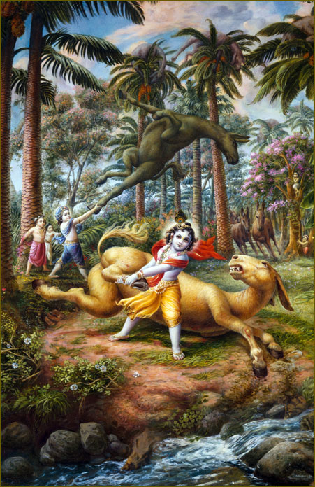 …After the demon was thrown into the trees, all the friends and associates of Dhenukāsura immediately assembled and attacked Balarāma and Kṛṣṇa with great force. They were determined to retaliate and avenge the death of their friend. But Kṛṣṇa and Balarāma began to catch each of the asses by the hind legs and, exactly in the same way, wheeled them around. Thus They killed all of them by throwing them into the palm trees. Because of the dead bodies of the asses, there was a panoramic scene. It appeared as if clouds of various colors were assembled in the trees. Hearing of this great incident, the demigods from the higher planets began to shower flowers on Kṛṣṇa and Balarāma and began to beat their drums and offer devotional prayers.