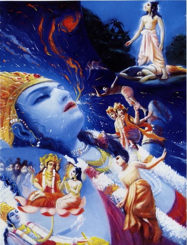 At the end of the millennium, when the Personality of Godhead Lord Nārāyaṇa lay down within the water of devastation, Brahmā began to enter into Him along with all creative elements, and I also entered through His breathing.