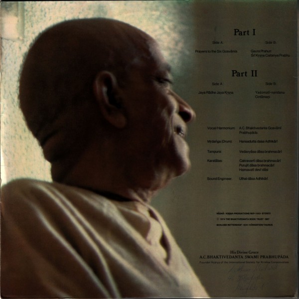 Produced by Hansadutta & the German Yatra, 1974. The album was recorded in June, 1974 at Schloss Rettershoff, during Srila Prabhupada’s visit there. It was his second and final visit to Germany. The devotees set up a recording room beneath the stairs, and Srila Prabhupada happily obliged their request to do a recording. Vocals and harmonium by Srila Prabhupada, Hansadutta on mrdanga, Cakravarti and Himavati play kartals. Read more about it: Classic ISKCON Vinyl – Srila Prabhupada’s Krsna Meditation Double LP.