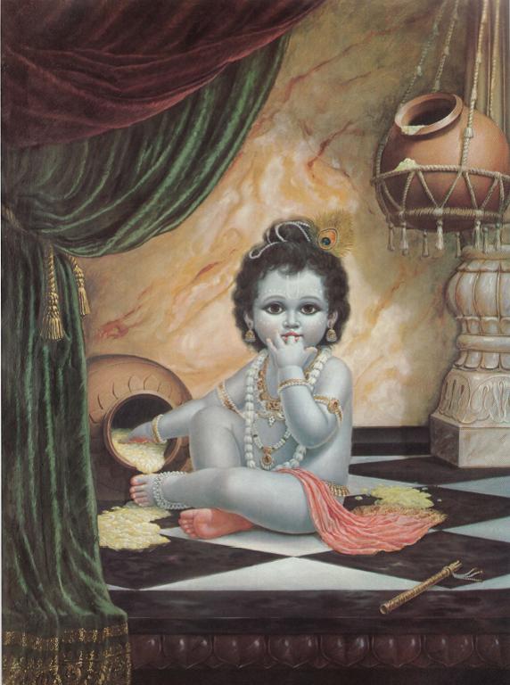 …Lord Śrī Kṛṣṇa is sometimes described as a thief. He is very famous amongst His pure devotees as the Mākhana-cora. He used to steal butter from the houses of neighbors at Vṛndāvana in His early age. Since then He is famous as a thief. But in spite of His being famous as a thief, He is worshiped as a thief, whereas in the mundane world a thief is punished and is never praised. Since He is the Absolute Personality of Godhead, everything is applicable to Him, and still in spite of all contradictions He is the Supreme Personality of Godhead. (from purport SB 1.10.19)