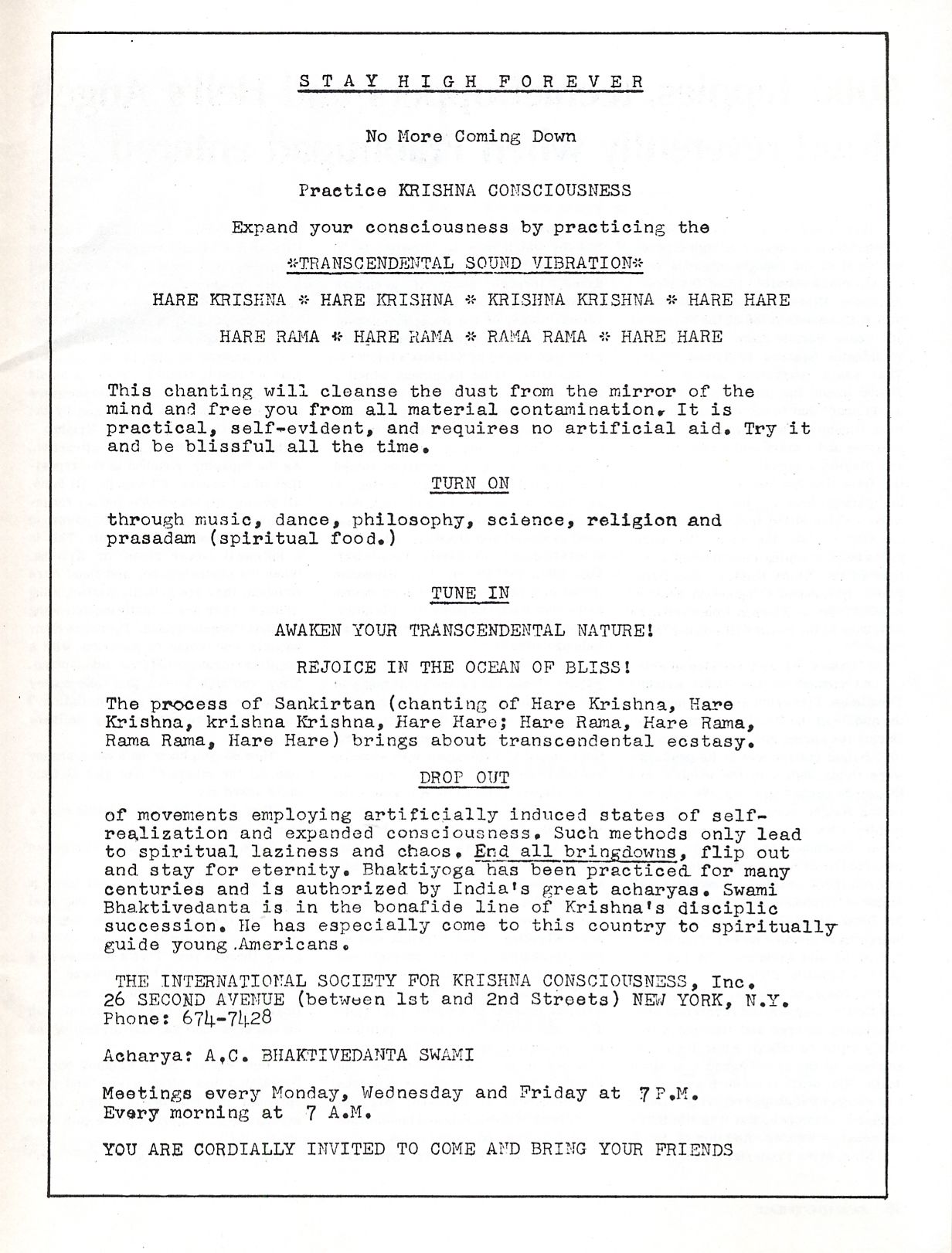 of movements employing artificially induced states of self-realization and expanded consciousness. Such methods only lead to spiritual laziness and chaos. End all bringdowns, flip out and stay for eternity. Bhaktiyoga has been practiced for many centuries and is authorized by India’s great acharyas. Swami Bhaktivedanta is in the bonafide line of Krishna’s disciplic succession. He has especially come to this country to spiritually guide young Americans.