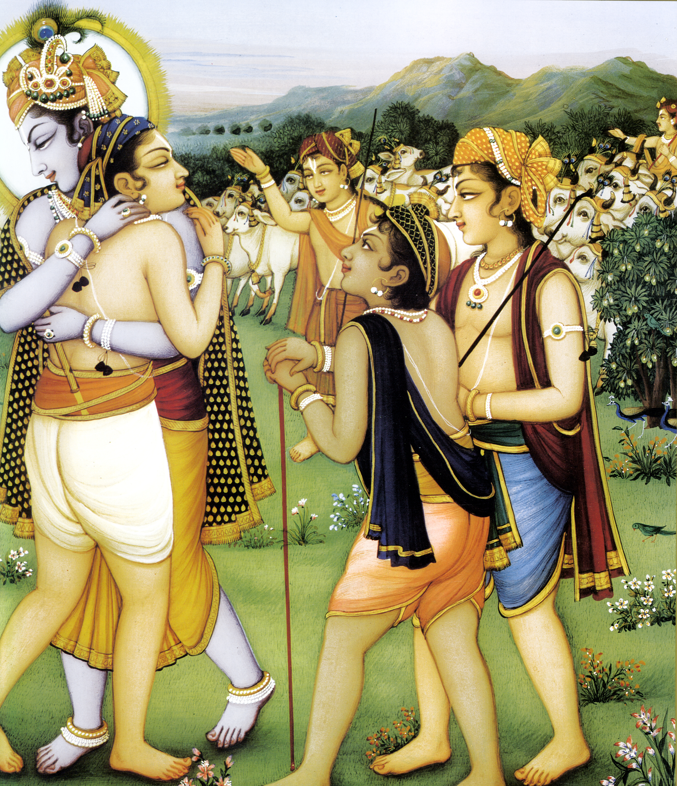 …The Lord descends to this mortal world to show His pastimes in Vṛndāvana, which are full of happiness. When Lord Śrī Kṛṣṇa was in Vṛndāvana, His activities with His cowherd boy friends, with His damsel friends, with the inhabitants of Vṛndāvana and with the cows were all full of happiness. The total population of Vṛndāvana knew nothing but Kṛṣṇa. But Lord Kṛṣṇa even discouraged His father Nanda Mahārāja from worshiping the demigod Indra because He wanted to establish the fact that people need not worship any demigod. They need only worship the Supreme Lord because their ultimate goal is to return to His abode. (from Introduction to the Bhagavad-gita As It Is)