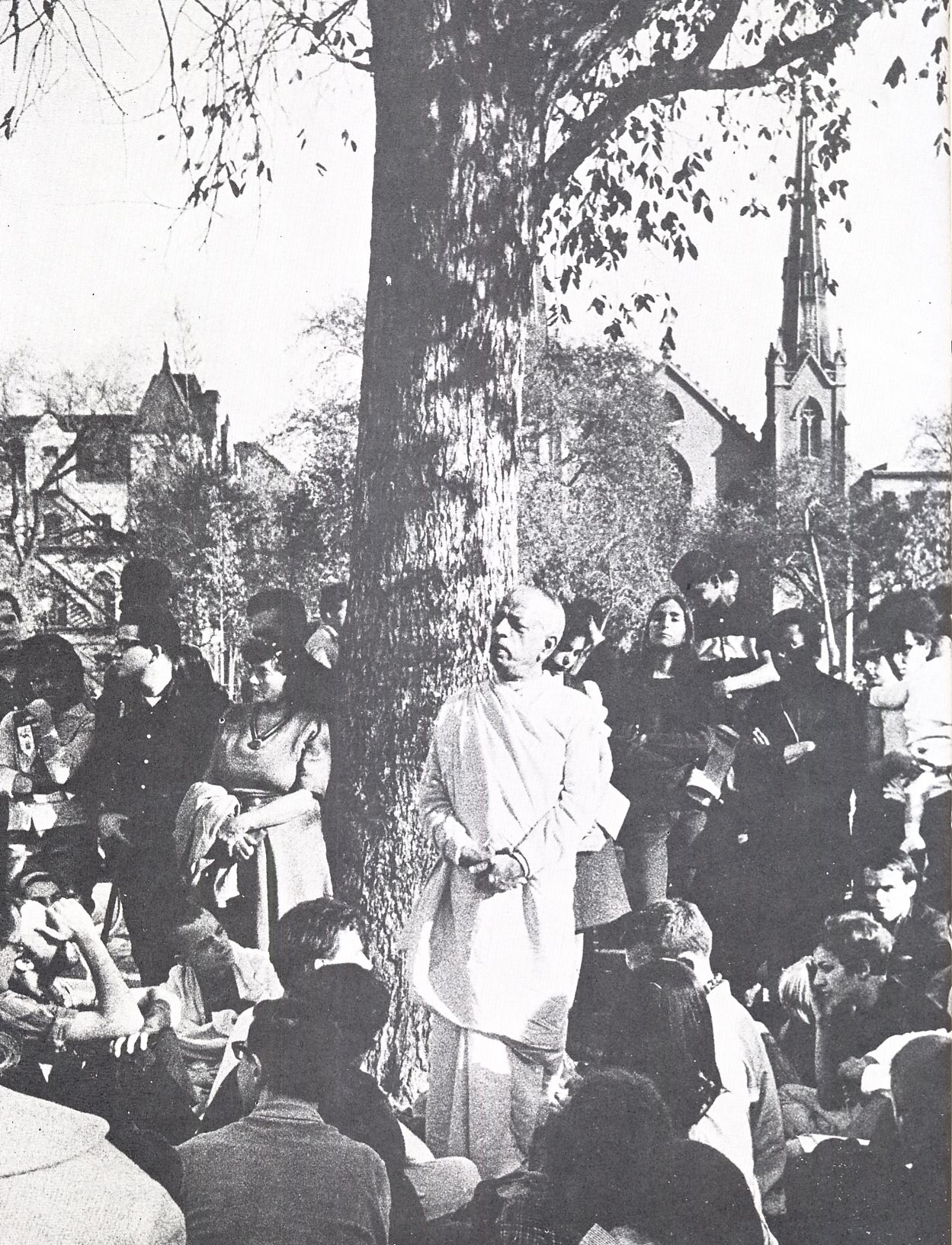 Prabhupad had prodigious energy. He was up every morning before any of us. He pounded the drum, exhausted everyone at Kirtan, chanted hymns, danced, delivered lectures, translated books, cooked and supervised all affairs. And he was triple the age of any one of us. To help spread the movement, Ginsberg suggested chanting in Tompkins Square Park where the hippies were starting to congregate. For four consecutive Sunday afternoons we held Kirtan in the center of the park. Prabhupad kept the rhythm of the Hare Krishna Mantra by pounding a small bongo drum somebody had given him. One Sunday he played the drum two hours incessantly, and his disciples practically fell out.