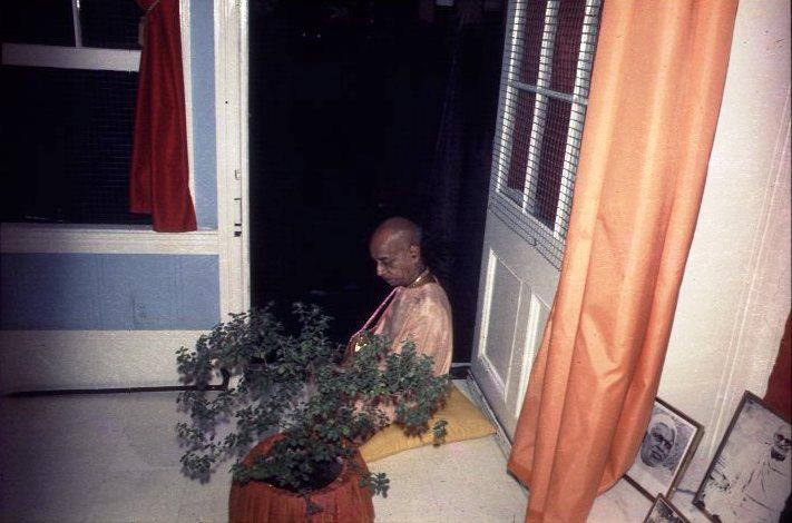 Please take care of the Tulasi plants in the following way. This is the best season for growing Tulasi plants. From 15 April to 15 June is the best season for growing this plant. Now I understand that the seedlings are coming out, so the whole spot if possible may be covered by some net because the seedling stage creepers, being very delicate, are sometimes eaten up by the sparrows, so we have to give a little protection from attack of the sparrows. All the devotees should pour water at least once in the morning before taking prasadam. The watering should not be very much large in quantity, but it should be poured just to keep the ground soft and moist. Sunlight also should be allowed. When the creepers are grown at least 7 inches high, then you can take them out from the planting soil and transplant them in a row in a different place. Then go on watering and they will grow like anything. I think this plant cannot grow in cold countries, but if the plants are dispatched from your place and if the devotees take care of the plant with a little care in a flower pot then it may grow.