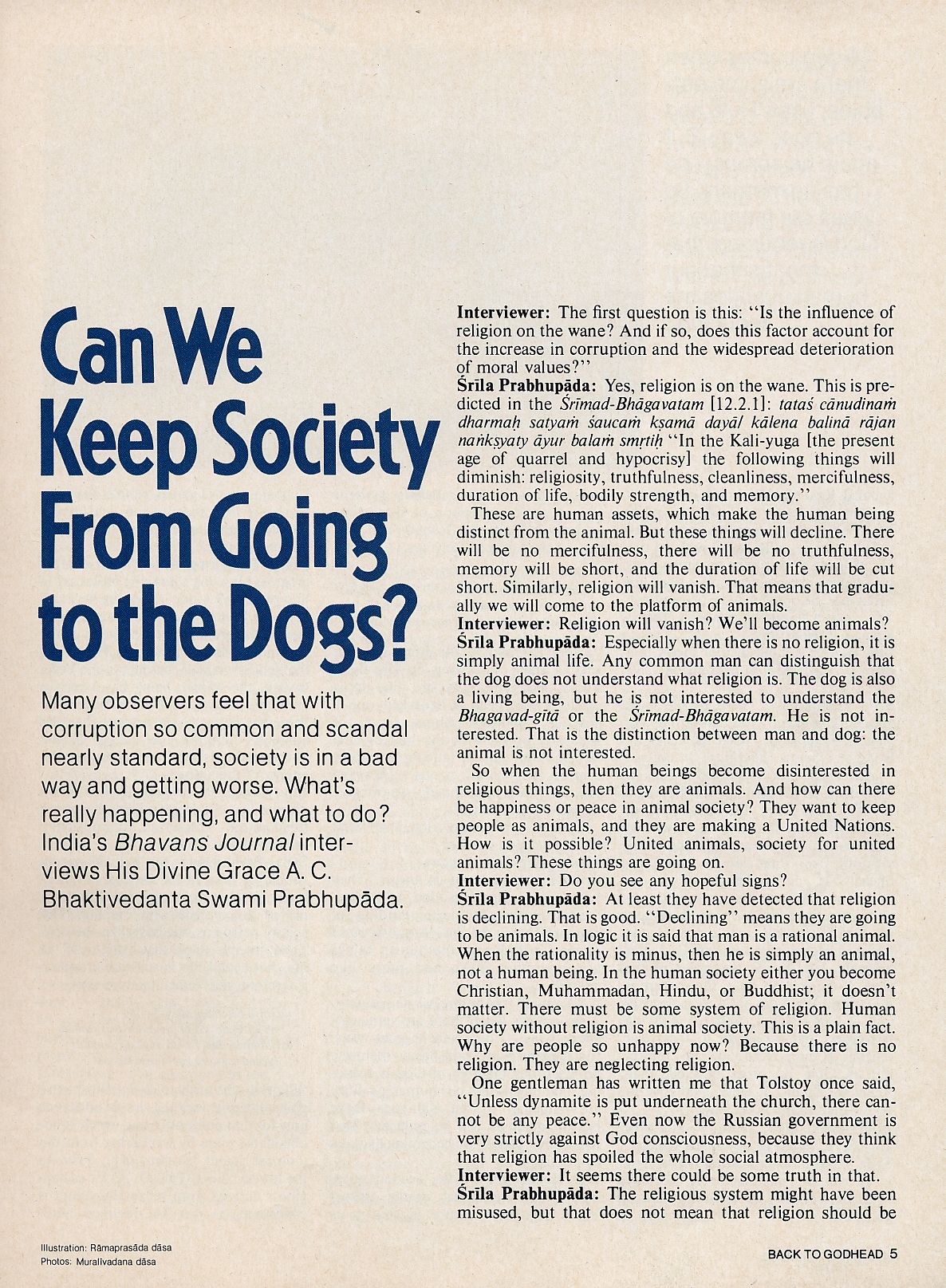 Many observers feel that with corruption so common and scandal nearly standard, society is in a bad way and getting worse. What’s really happening, and what to do? India’s Bhavans Journal interviews His Divine Grace A.C. Bhaktivedanta Swami Prabhupada.