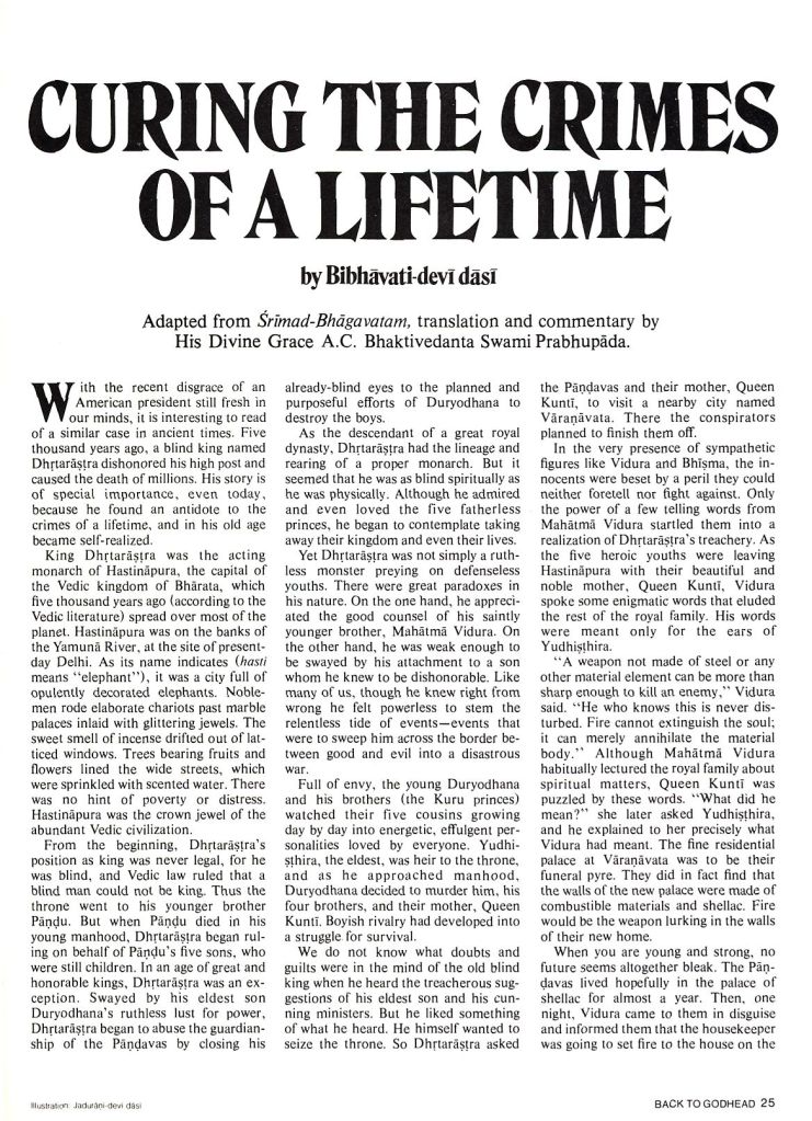 With recent disgrace of an American president still fresh in our minds, it is interesting to read of a similar case in ancient times. Five thousand years ago, a blind king named Dhrtarastra dishonored his high post and caused the death of millions. His story is of special importance, even today, because he found an antidote to the crimes of a lifetime, and in his old age became self-realized.