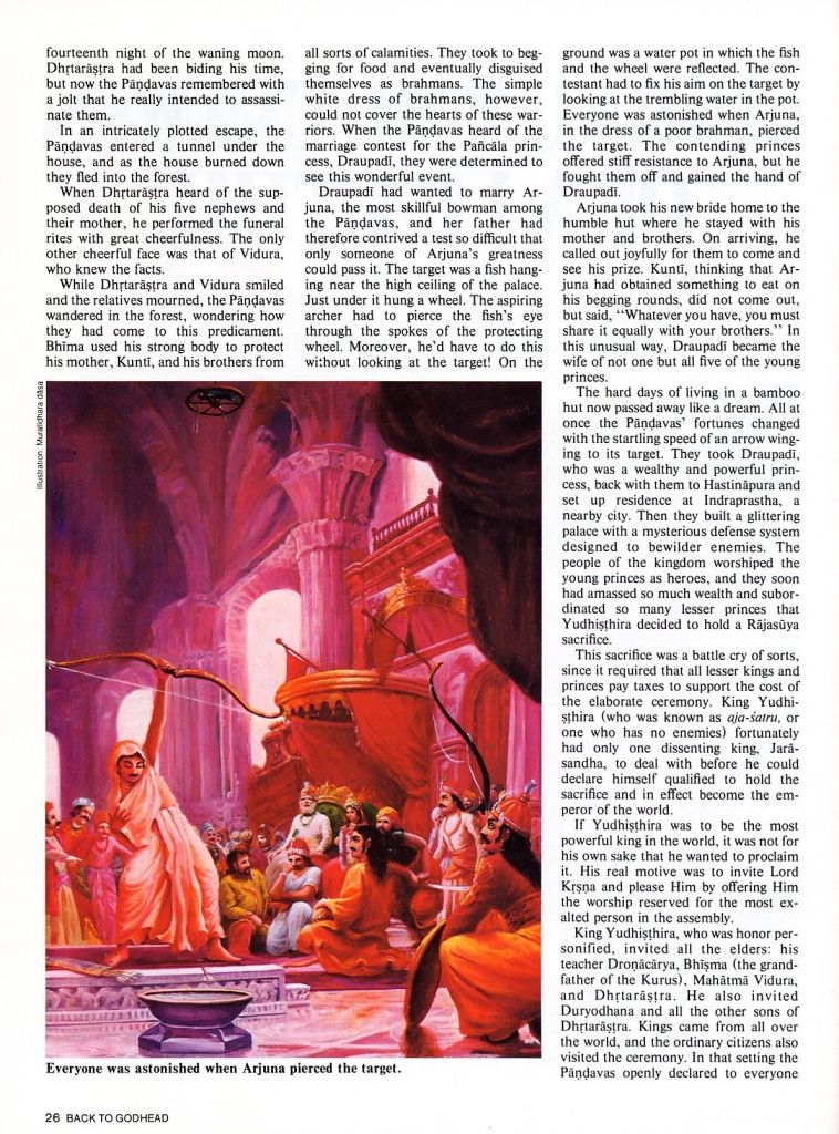 Draupadi had wanted to marry Arjuna, the most skillful bowman among the Pandavas, and her father had therefore contrived a test so difficult that only someone of Arjuna’s greatness could pass it. The target was a fish hanging near the high ceiling of the palace. Just under it hung a wheel. The aspiring archer had to pierce the fish’s eye through the spokes of the protecting wheel. Moreover, he’d have to do this without looking at the target! On the ground was a water pot in which the fish and the wheel were reflected. The contestant had to fix his aim on the target by looking at the trembling water in the pot. Everyone was astonished when Arjuna, in the dress of a poor brahman, pierced the target. The contending princes offered stiff resistance to Arjuna, but he fought them off and gained the hand of Draupadi.