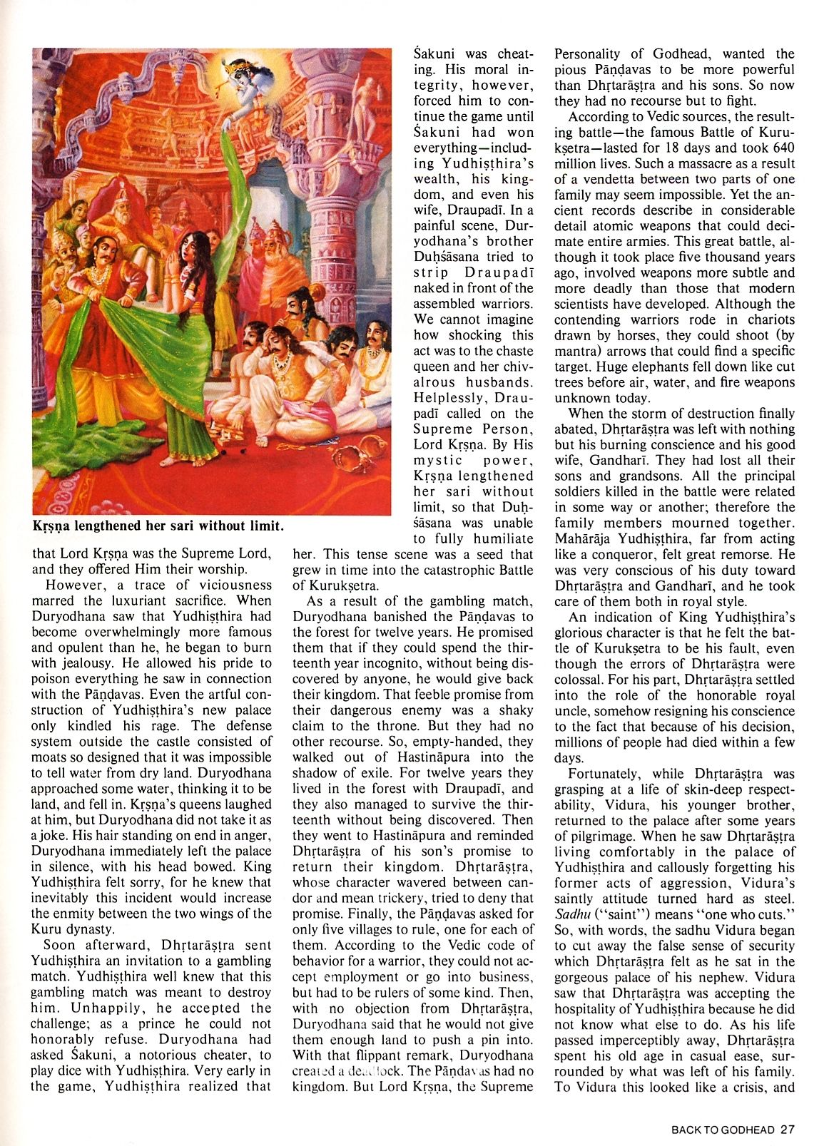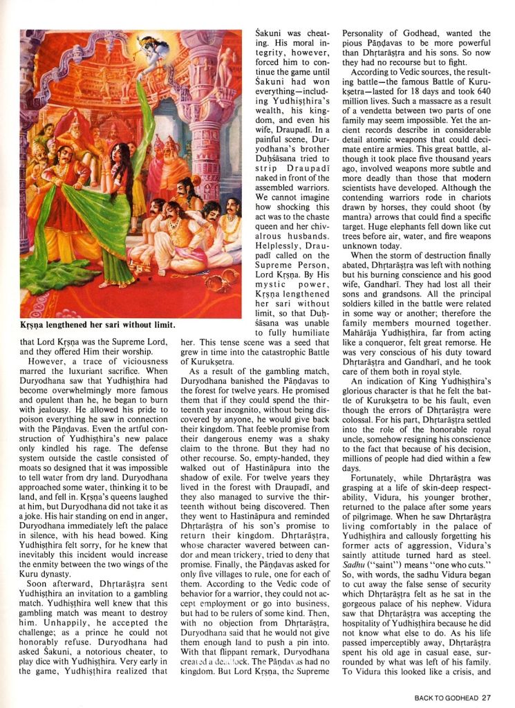Soon afterward, Dhrtarastra sent Yudhisthira an invitation to a gambling match. Yudhisthira well knew that this gambling match was meant to destroy him. Unhappily, he accepted the challenge; as a prince he could not honorably refuse. Duryodhana had asked Sakuni, a notorious cheater, to play dice with Yudhisthira. Very early in the game, Yudhisthira realized that Sakuni was cheating. His moral integrity, however, forced him to continue the game until Sakuni had won everything—including Yudhisthira’s wealth, his kingdom, and even his wife, Draupadi. In a painful scene, Duryodhana’s brother Duhsasana tried to strip Draupadi naked in front of the assembled warriors. We cannot imagine how shocking this act was to the chaste queen and her chivalrous husbands. Helplessly, Draupadi called on the Supreme Person, Lord Krsna. By His mystic power, Krsna lengthened her sari without limit, so that Duhsasana was unable to fully humiliate her. This tense scene was a seed that grew in time into the catastrophic Battle of Kuruksetra.