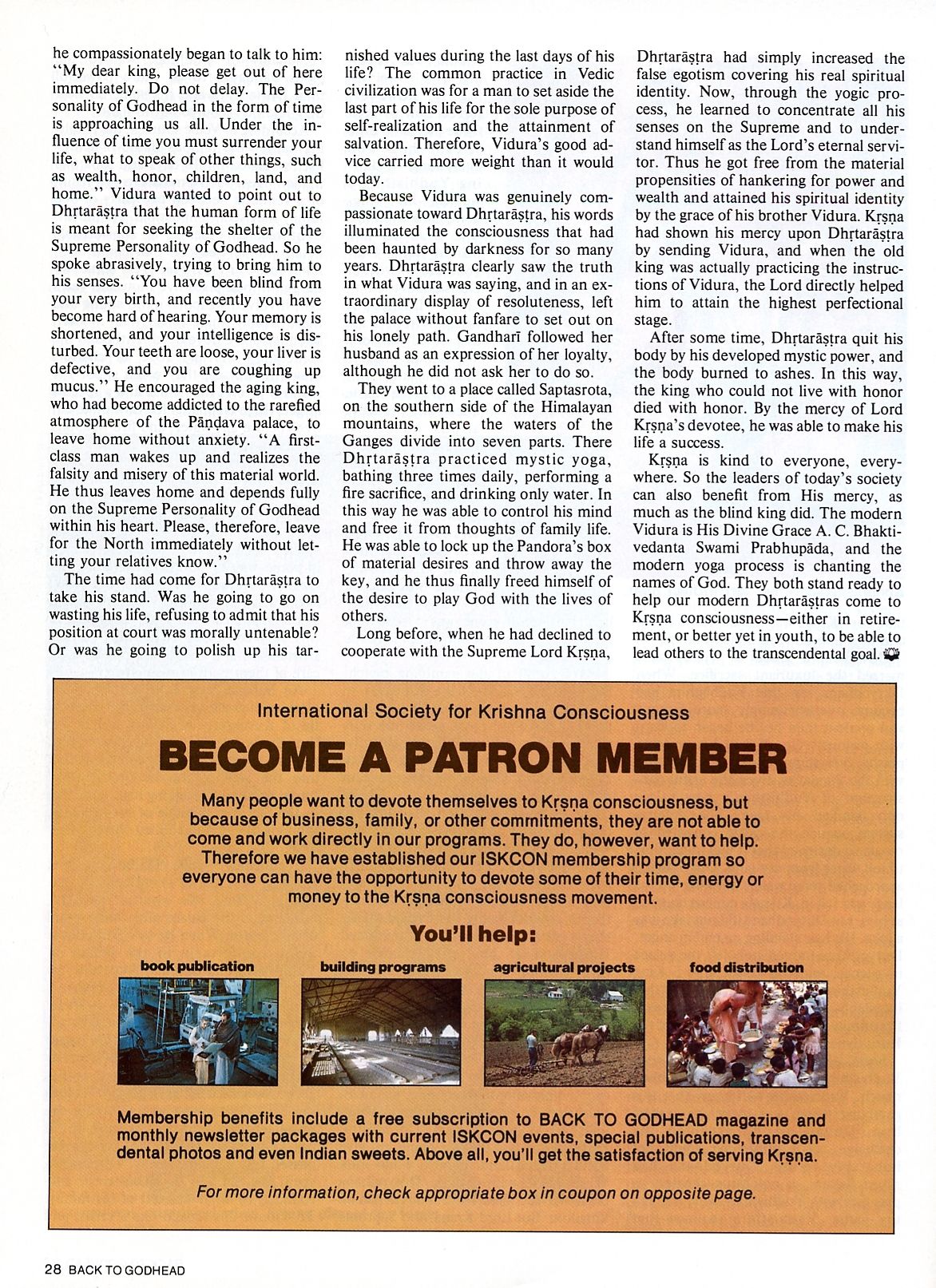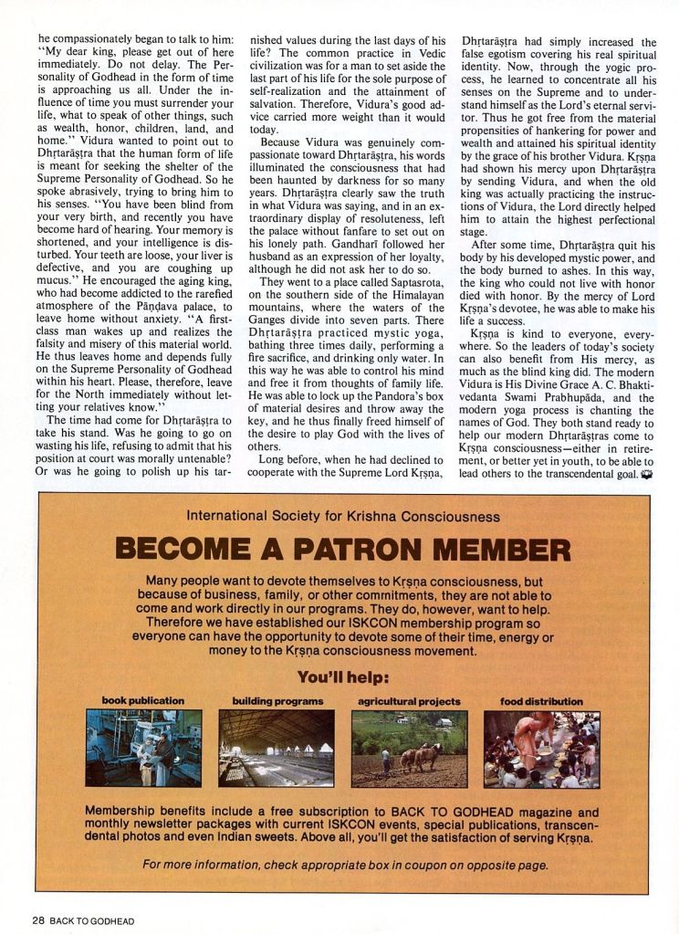 Krsna is kind to everyone, everywhere. So the leaders of today’s society can also benefit from His mercy, as much as the blind king did. The modern Vidura is His Divine Grace A.C. Bhaktivedanta Swami Prabhupada, and the modern yoga process is chanting the names of God. They both stand ready to help our modern Dhrtarastras come to Krsna consciousness—either in retirement, or better yet in youth, to be able to lead others to the transcendental goal.