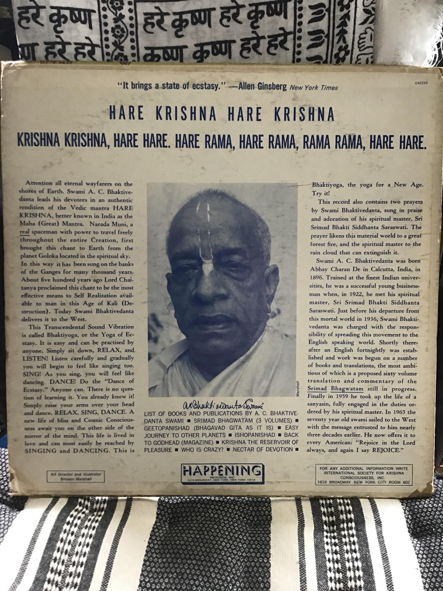 “Now you have made your best record,” Swamiji told Mr. Kallman as he left the studio for the freezing Manhattan evening. Swamiji got into the front seat of the Volkswagen bus while “The Hare Krsna Chanters” climbed into the back with their instruments, and Rupanuga drove them back home, back to the Lower East Side.”