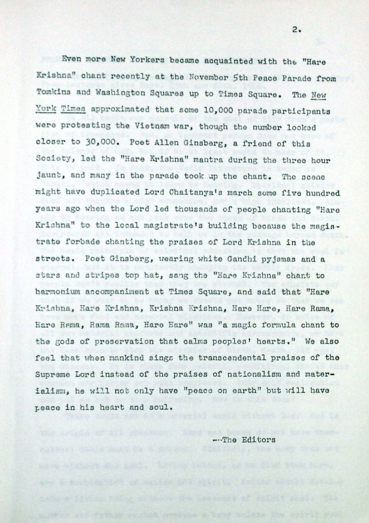 Even more New Yorkers became acquainted with the “Hare Krishna” chant recently at the November 5th Peace Parade from Tomkins and Washington Squares up to Times Square. The New York Times approximated that some 10,000 parade participants were protesting the Vietnam war, though the number looked closer to 30,000. Poet Allen Ginsberg, a friend of this Society, led the “Hare Krishna” mantra during the three hour jaunt, and many in the parade took up the chant. The scene might have duplicated Lord Chaitanya’s march some five hundred years ago when the Lord led thousands of people chanting “Hare Krishna” to the local magistrate’s building because the magistrate forbade chanting the praises of Lord Krishna in the streets. Poet Ginsberg, wearing white Gandhi pyamas and a stars and stripes top hat, sang the “Hare Krishna” chant to harmonium accompaniment at Times Square, and said that “Hare Krishna, Hare Krishna, Krishna Krishna, Hare Hare, Hare Rama, Hare Rama, Rama Rama, Hare Hare” was “a magic formula chant to the gods of preservation that calms peoples’ hearts.” We also feel that when mankind sings the transcendental praises of the Supreme Lord instead of the praises of nationalism and materialism, he will not only have “peace on earth” but will have peace in his heart and soul.