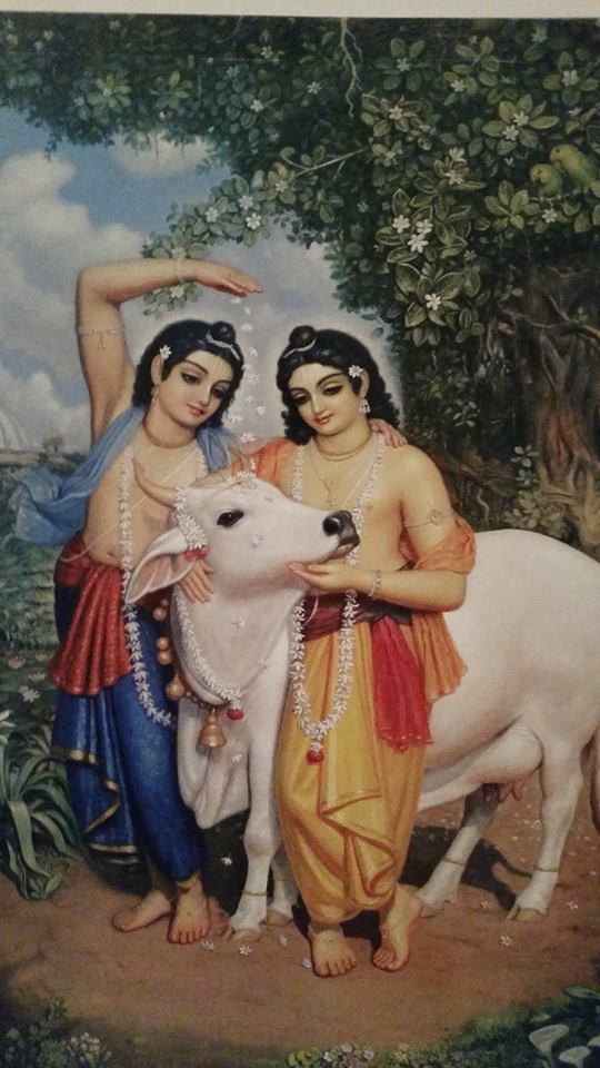 …One day, when Kṛṣṇa, along with Balarāma, was maintaining the calves in the forest, They saw some cows grazing on the top of Govardhana Hill. The cows could see down into the valley where the calves were being taken care of by the boys. Suddenly, on sighting their calves, the cows began to run towards them. They leaped downhill with joined front and rear legs. The cows were so melted with affection for their calves that they did not care about the rough path from the top of Govardhana Hill down to the pasturing ground. They began to approach the calves with their milk bags full of milk, and they raised their tails upwards. When they were coming down the hill, their milk bags were pouring milk on the ground out of intense maternal affection for the calves, although they were not their own calves. These cows had their own calves, and the calves that were grazing beneath Govardhana Hill were larger; they were not expected to drink milk directly from the milk bag but were satisfied with the grass. Yet all the cows came immediately and began to lick their bodies, and the calves also began to suck milk from the milk bags. There appeared to be a great bondage of affection between the cows and calves. (Chapter 13 The Stealing of the Boys and Calves by Brahma)