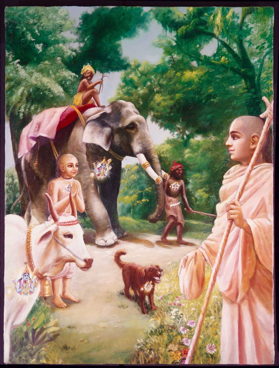 The humble sage, by virtue of true knowledge, sees with equal vision a learned and gentle brāhmaṇa, a cow, an elephant, a dog and a dog-eater [outcaste]. (Bg 5.18)