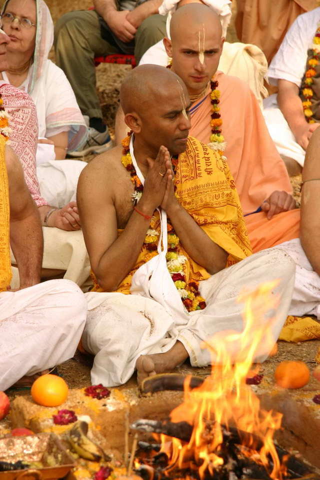 During the fire sacrifice it was Hridayananda Maharaja that was standing next to the Vyasasana and handed out the beads and asked for the four regulative principles. Each time a new name was given there was a loud HARIBOL and everyone applauded.