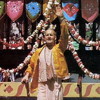 Then in 1969 we built a much bigger cart, with a tall silk canopy, like the ones they build in Jagannath Puri in India. But in 1970 we worked for two months straight and built the three big carts, basically the same ones we use now. Also, we had all kinds of publicity—TV, billboards, posters. And Srila Prabhupada came to that Ratha-yatra. So a lot of people came, maybe 12,000 people. It was big—a tremendous success. We had a few mishaps, though. One cart broke down in the middle of the parade. And it was a bitter cold day. But even though it was so cold at the beach, thousands of people stayed there with us and ate a lot of Krsna prasad (spiritual food offered to Krishna). We brought 20 50-gallon barrels of prasad, and they ate it all.
