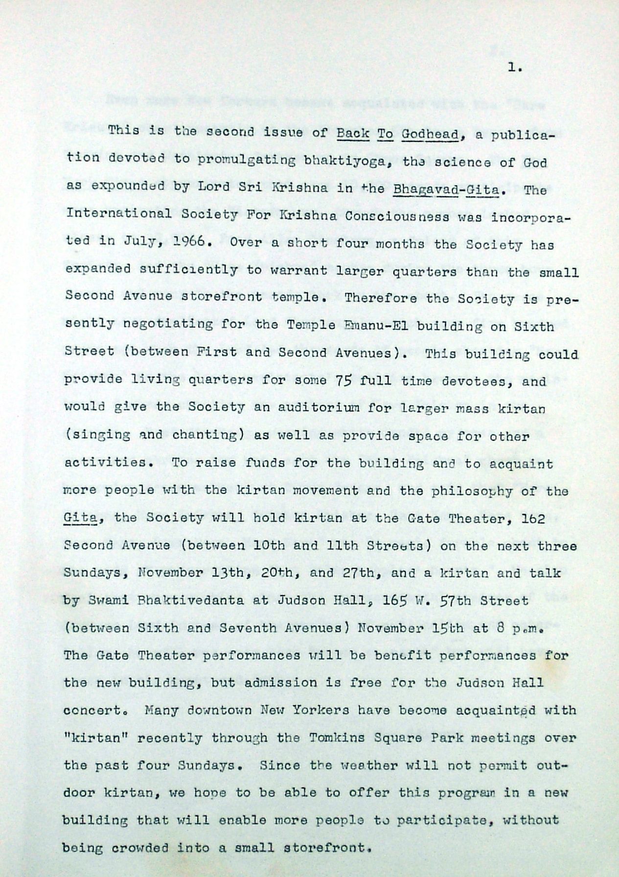 Today marks the auspicious 50th anniversary of Srila Prabhupada’s incorporation of ISKCON New York, in 1966. To honor this special day we have re-posted a very nice article which appeared yesterday on the Sampradaya Sun entitled “Incorporation of ISKCON”, we have posted the “Certificate on Incorporation”, as well as a very timely verse and purport from the Srimad Bhagavatam. Some of the purport follows…
