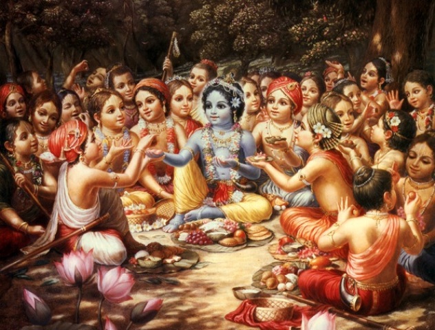 On hearing this proposal from Kṛṣṇa, all the boys became very glad and said, ”Certainly, let us all sit down here to take our lunch.“ They then let loose the calves to eat the soft grass. Sitting down on the ground and keeping Kṛṣṇa in the center, they began to open their different boxes brought from home. Lord Śrī Kṛṣṇa was seated in the center of the circle, and all the boys kept their faces toward Him. They ate and constantly enjoyed seeing the Lord face to face. Kṛṣṇa appeared to be the whorl of a lotus flower, and the boys surrounding Him appeared to be its different petals. The boys collected flowers, leaves of flowers and barks of trees and placed them under their different boxes, and thus they began to eat their lunch, keeping company with Kṛṣṇa. While taking lunch, each boy began to manifest different kinds of relations with Kṛṣṇa, and they enjoyed each other’s company with joking words. While thus enjoying lunch with His friends, Lord Kṛṣṇa’s flute was pushed within the belt of His cloth, and His bugle and cane were pushed in on the left-hand side of His cloth. He was holding a lump of foodstuff prepared with yogurt, butter, rice and pieces of fruit salad in His left palm, which could be seen through His petal-like finger joints. The Supreme Personality of Godhead, who accepts the results of all great sacrifices, was laughing and joking, enjoying lunch with His friends in Vṛndāvana. And thus the scene was being observed by the demigods from heaven. As for the boys, they were simply enjoying transcendental bliss in the company of the Supreme Personality of Godhead. (excerpted from: KRSNA Book Chapter 13 entitled “The Stealing of the Boys and Calves by Brahmā”)