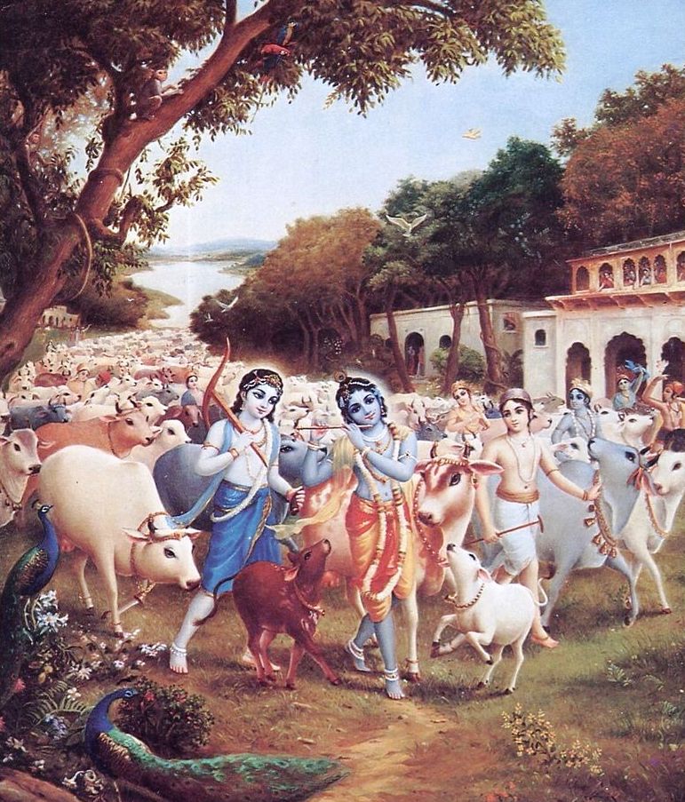 …Accompanied by the cowherd boys and Balarāma, Kṛṣṇa brought forward the cows and played on His flute through the forest of Vṛndāvana, which was full of flowers, vegetables, and pasturing grass. The Vṛndāvana forest was as sanctified as the clear mind of a devotee and was full of bees, flowers and fruits. There were chirping birds and clear water lakes with waters that could relieve one of all fatigues. Sweet flavored breezes blew always, refreshing the mind and body. Kṛṣṇa, with His friends and Balarāma, entered the forest and, seeing the favorable situation, enjoyed the atmosphere to the fullest extent. Kṛṣṇa saw all the trees, overloaded with fruits and fresh twigs, coming down to touch the ground as if welcoming Him by touching His lotus feet. He was very pleased by the behavior of the trees, fruits and flowers, and He began to smile realizing their desires. (Chapter 15 Killing of Dhenukasura)