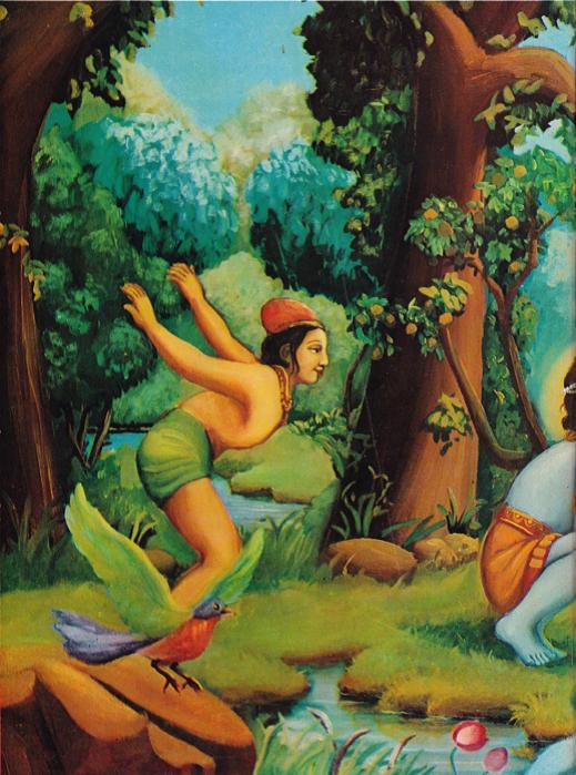 All the boys would be differently engaged. Some boys blew their flutes, and others blew bugles made of horn. Some imitated the buzzing of the bumblebees, and others imitated the voice of the cuckoo. Some boys imitated flying birds by running after the birds’ shadows on the ground, some imitated the beautiful movements and attractive postures of the swans, some sat down with the ducks, sitting silently, and others imitated the dancing of the peacocks. Some boys attracted young monkeys in the trees, some jumped into the trees, imitating the monkeys, some made faces as the monkeys were accustomed to do, and others jumped from one branch to another. Some boys went to the waterfalls and crossed over the river, jumping with the frogs, and when they saw their own reflections on the water they would laugh. They would also condemn the sounds of their own echoes. In this way, all the cowherd boys used to play with Kṛṣṇa, who is the source of the Brahman effulgence for jñānīs desiring to merge into that effulgence, who is the Supreme Personality of Godhead for devotees who have accepted eternal servitorship, and who for ordinary persons is but another ordinary child. The cowherd boys, having accumulated the results of pious activities for many lives, were able to associate in this way with the Supreme Personality of Godhead. How can one explain their great fortune? (SB 10.12.7-11)