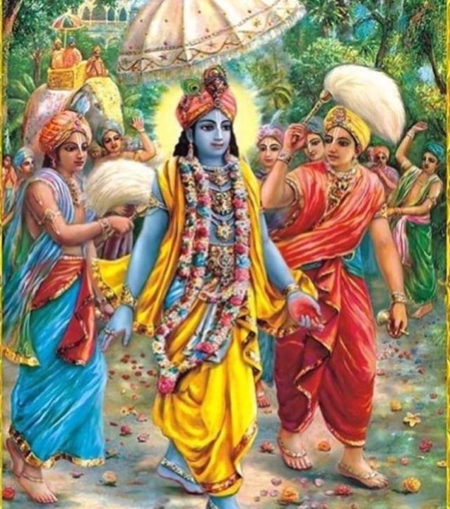 Devotees engaged in servitude are attached to Krishna in the affection of reverence. Some of the inhabitants of Gokula (Vrindavan) as exhibited on earth) are attached to Krishna on this platform of affection in reverence. The inhabitants of Vrindavan used to say, “Kṛṣṇa is always manifest before us with a complexion like a blackish cloud. He holds His wonderful flute in His lotus hands. He is dressed in yellow silks and bedecked with a peacock feather on His head. When Krishna walks near Govardhan Hill with these personal features, all the inhabitants of the heavenly planets, as well as the inhabitants of this earth, feel transcendental bliss and consider themselves the eternal servants of the Lord.”